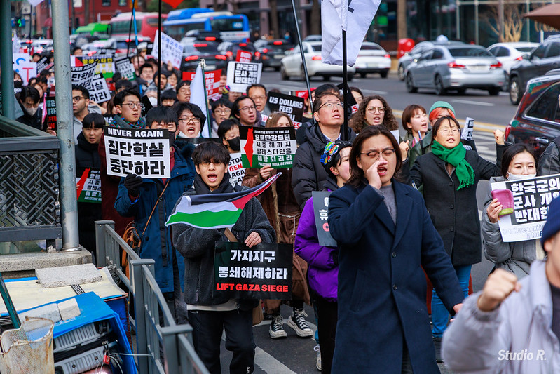 지난 1월 7일 주한이스라엘대사관 앞 팔레스타인 연대 집회 후 행진 중인 시민들ⓒ 스튜디오R 현재 163개의 시민사회단체들이 ‘팔레스타인과 연대하는 한국 시민사회 긴급행동’이라는 연대체를 구성하고 서울과 광주에서 운동을 이어가고 있다. 그밖에 울산과 전주에서도 빈번하게 연대 행동과 선전 활동이 활발하게 펼쳐지고 있다. 격주마다 벌어지는 주한이스라엘대사관 앞에서의 항의 집회, 그밖에 비수도권 지역에서의 연대 행동들을 보다 크게 조직해야 한다. 계속해서 휴전을 거부하면서 집단학살 만행을 이어가는 이스라엘 점령당국을 비판하고, 휴전을 촉구하는 여론과 운동의 힘을 키워야 한다.