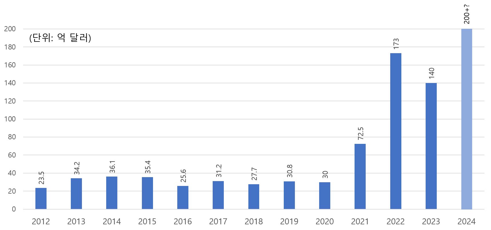 한국 무기 수출 수주액 추이 (출처: 방위사업청, 산업연구원) 러시아-우크라이나 전쟁 같은 비극도 무기산업에는 호재다. 2023년 산업연구원이 낸 보고서는 러시아-우크라이나 전쟁이 한국 같은 신흥 무기 수출국에게 ‘천재일우’의 기회라고 표현했다. 우크라이나에 살상무기는 지원하지 않는다는 방침이 무색하게, 한국은 제3국을 통해 우크라이나에 포탄을 우회 공급하는 등 이 기회를 적극 활용 중이다.