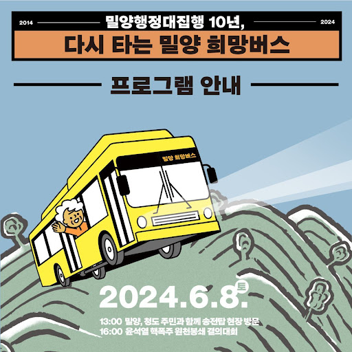 2024년 다시 타는 밀양 희망버스ⓒ환경운동연합(https://kfem.or.kr) 2024년 6월 8일 일요일 밀양 시위 10주년을 맞아 전국 각지에서 수백 명이 폭우 속에서도 희망버스를 타고 다시 이곳을 찾았다. 그중 몇 명과 함께 115호 송전탑 아래 집회에 갔는데, 그 주인공이 바로 ‘밀양 할머니’였다. 할머니들의 소박한 모습에서 거대한 행위주체성이 느껴졌다. 이어 밀양 시내 강변에서 전국 40~50개 단체가 공동으로 기념행사를 주최했다. 이 행사에서 연설과 다양한 공연이 번갈아 가며 진행되었고, 연사의 절반 이상이 지역 대표를 맡은 여성들이어서 환경보호와 한국 사회운동 전반에서 여성의 역할을 생생하게 느낄 수 있었다. 집회에 참여한 어르신들의 춤을 따라 하는 초등학생들의 모습에서 민중 행동 정신의 계승을 느낄 수 있었다. 마지막으로 관객들이 북소리에 맞춰 자유롭게 춤을 추며 정의와 기본적 인권을 추구하는 것이 어렵고 비극적일 수도 있지만 즐겁고 유쾌할 수도 있다는 것을 느끼게 해주었다.
