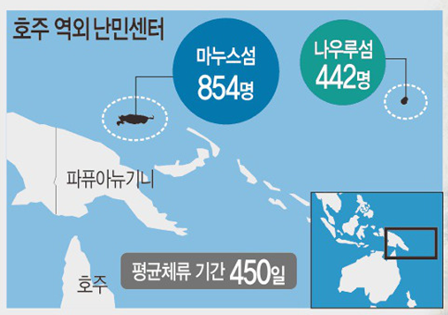 -난민을 남태평양의 섬들(나우루, 마누스, 크리스마스)에 분산 수용하는 ‘퍼시픽 솔루션’ 발표2003 크리스마스섬에 1200명 규모의 난민 수용소 개소 2008 호주 노동당 정부 ‘퍼시픽 솔루션’ 포기, 나우루, 마누스섬 수용소 폐쇄 2010 크리스마스섬 난민 수용 규모 2400명까지 확대 2012 호주 자유당 정부 ‘퍼시픽 솔루션’ 재가동, 나우루 난민 수용소 재가동 2013 파푸아뉴기니 마누스섬 수용소에서 난민 재정착 방침 발표 2014 난민용 임시보호비자 발급 대상에서 나우루 수용소 난민 제외 2015 크리스마스섬 탈출 감행 난민 사망 및 폭동 사태 발생 <표1> 호주의 주요 역외 난민 수용 정책 연표