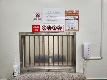 화성외국인보호소면회실 ⓒ 2022년 1월 18일자 한국일보 https://www.hankookilbo.com/News/Read/A2021123115380004830 화성외국인보호소 면회실 사진. 상단에 “이곳은 국가보안시설이므로 일체 사진촬영을 금지합니다”라는 문구가 보인다. 사실상 이러한 조치는 심각한 인권 침해 상황을 외부로 알리는 것을 원천 차단하는 기능을 한다. ‘공익적 목적이 있다’는 변호사의 자문을 받아 면회실 사진을 공개한 2022년 1월 8일자 한국일보 기사와 그 취지를 같이 하며 이 글에서도 면회실 사진을 공개한다.