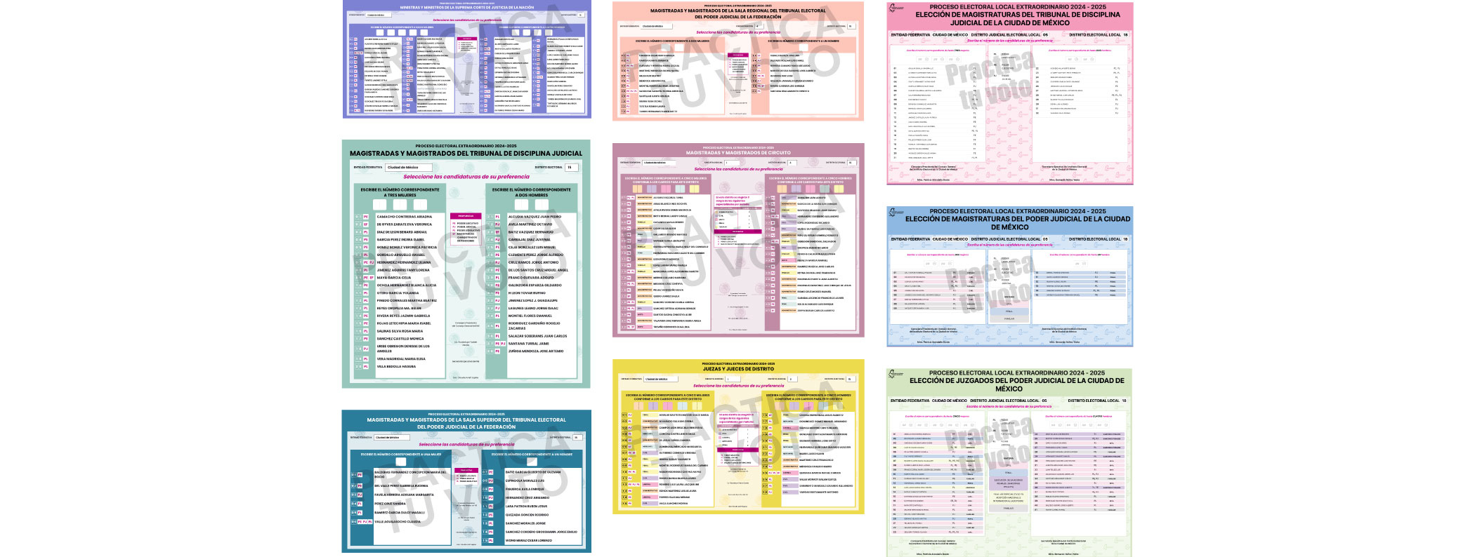 지역에 따라 한 사람이 최대 9장의 투표용지를 배부받았다 ⓒ 멕시코선거관리위원회에서 제공한 투표용지 샘플 판사를 선출한다는 획기적인 변화만이 아니라 선거운동과 선거 절차 역시 기존의 대통령과 의회 선거와는 매우 달랐으며, 이 모든 ‘다름’은 의구심으로 표출되었다. 후보 결정과 선거 과정에 대통령의 입김이 작용하여 사법권의 자율성을 훼손하지는 않는지, 투표용지 9장에 올바른 투표를 할 수 있는지, 다시 말해 유권자의 문해력이 충분한지, 후보의 정치적 입장에 따라 당락이 결정되는 것은 아닌지, 판사 당선인이 대중적인 인기만 쫓으며 판사로서의 전문성이 결여된 인물은 아닌지 등등 우려와 비판이 전문가들 사이에서 끊이지 않았다. 반면, 직접 선거를 통해 권리를 행사하게 된 국민 대다수는 자신에게 주어진 권리에 환호하거나 그 권리를 지키기 위해 적극적인 태도를 보이지 않았다. 그들은 여전히 ‘수동적’이었다. 이는 선거의 정당에 대한 또 다른 의구심을 낳았다.